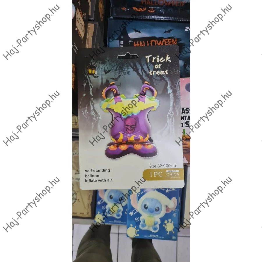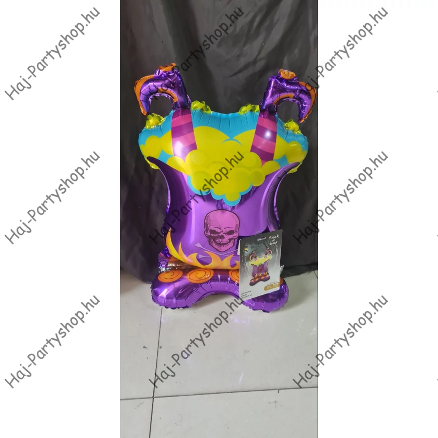 Dobd fel a Halloween hangulatát ezzel a nagyméretű, önállóan megálló boszorkány üstös fólia lufival! A lila-fekete üstből zöld füst száll fel, elején pedig félelmetes koponya minta látható.