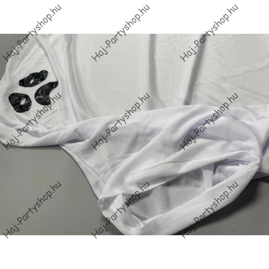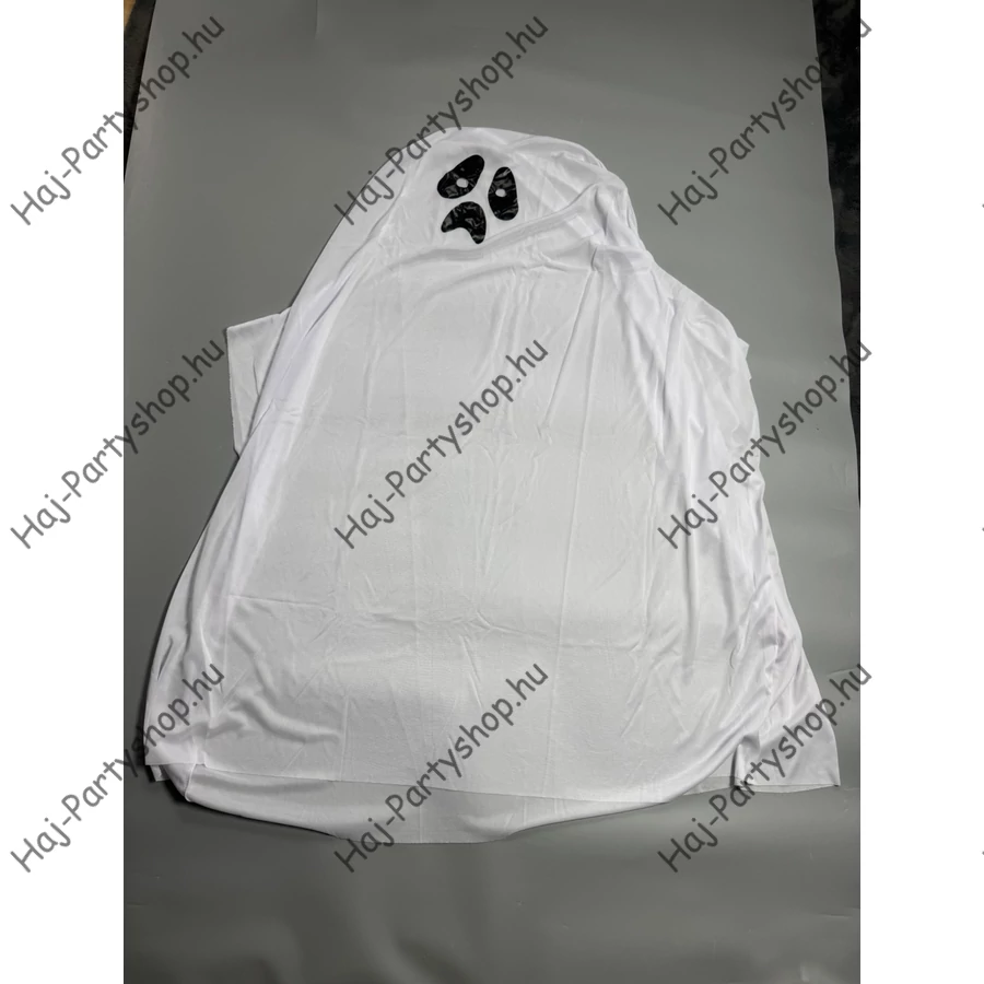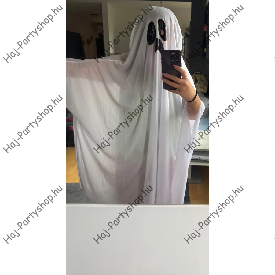 Ez a könnyű, univerzális méretű lepel fekete szem- és szájmintával díszített, így azonnal felismerhető és ijesztő hatást kelt. Gyorsan felvehető, kényelmes viselet, és minden buliban garantáltan mosolyt vagy sikolyt csal az arcokra.