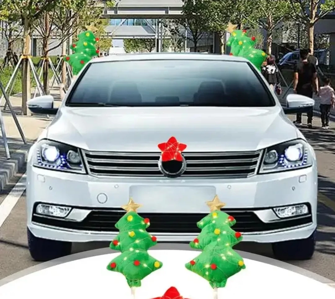 A két oldalsó ablakra pattintható plüss karácsonyfák arany csillaggal és színes díszgömbökkel vannak ellátva, így igazán látványosak vezetés közben is. A piros csillag a hűtőrácsra kerül, így teljes karácsonyi összképet ad – mintha az autód maga lenne egy mozgó karácsonyfa!