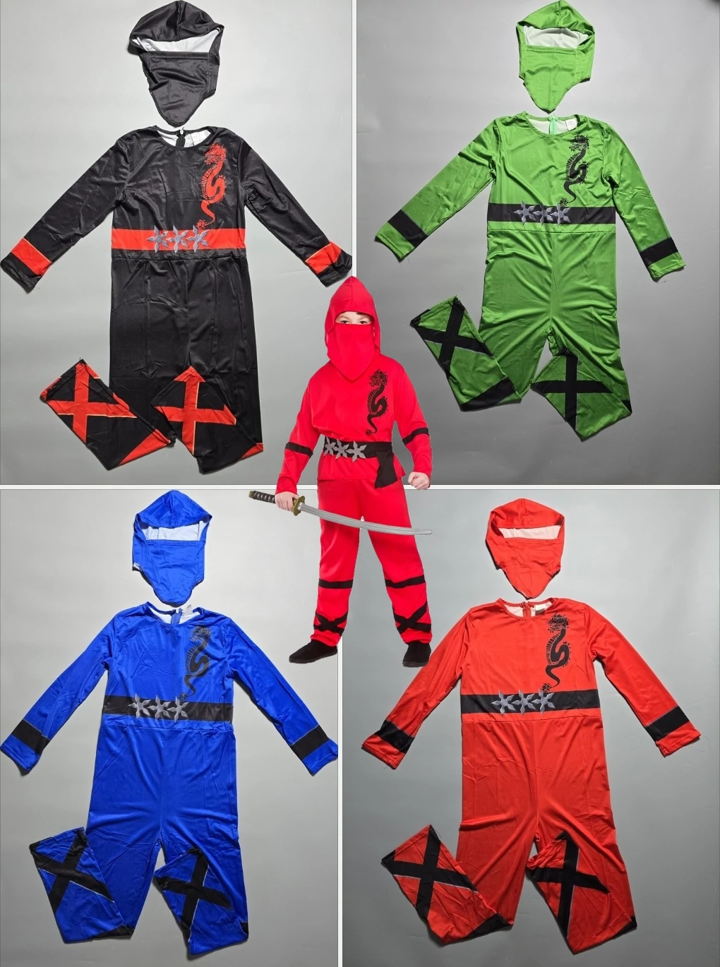 Ninjago ihlette gyerek Ninja jelmez 4 színben: piros, fekete, kék, zöld. Elérhető S, M és L méretben.